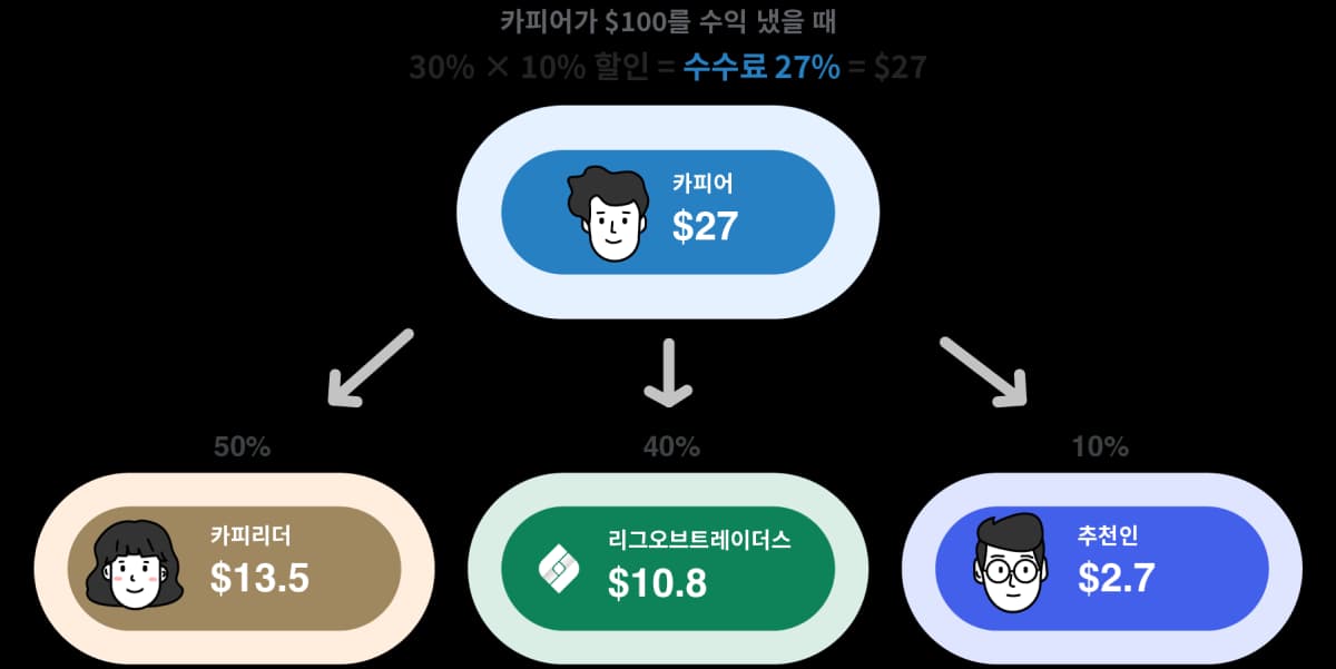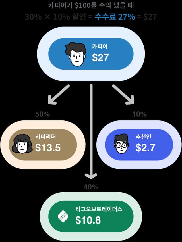 사용자가 귀하의 추천인 코드로 가입하고 카피 트레이딩을 시작하면 카피 트레이딩 수수료의 10%를 귀하의 리그오브트레이더스 지갑으로 받게 됩니다!